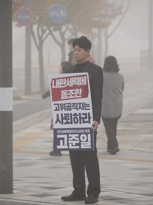 “세종시의 공직사회, 헌법 가치와 시민 신뢰 지켜야”[SRT(에스알 타임스) 서중권 기자] 고준일 전 세종시의회 의장이 지난 6일 세종시 국세청 앞 사거리에서 ‘내란세력에 동조한 고위공직자는 사퇴하라’는 피켓을 들고 1인 시위에 나섰다.고 전 의장은 “이재명 정부가 추진하는 개혁의 출발점은 공직사회의 내란 잔재 청산”이라며 “세종시 공직사회가 헌법 질서의 최후 보루가 돼야 한다”고 강조했다.이어 그는 “지난해 12월 3일 윤석열 전 대통령의 불법 계엄 사태 이후에도 내란은 종식되지 않았다. 오히려 내란 세력이 정부기관 곳곳에 남아