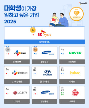 [SRT(에스알 타임스) 전지선 기자] SK하이닉스가 ‘2025 대학생이 일하고 싶은 기업’에서 사상 처음으로 1위에 올랐다.HR 테크기업 인크루트는 2004년부터 22년간 매년 하반기 공채를 앞두고 조사하는 ‘2025 대학생이 일하고 싶은 기업’을 28일 발표했다.올해 조사는 구직 중인 대학생 1,176명을 대상으로 국내 증시(코스피·코스닥) 시가총액 상위 170개사(6월 5일 기준, 지주사·금융사·공기업 제외)를 대상으로 이뤄졌다.먼저 올해 1위는 사상 처음으로 SK하이닉스(7.1%)가 차지했다. 지난해보다 순위가 무려 8위나