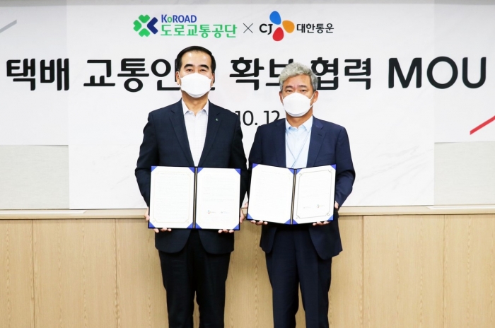 [SRT(에스알 타임스) 최형호 기자] 도로교통공단이 CJ대한통운과 12일 서울 중구 CJ대한통운 본사에서 택배종사자의 교통안전을 확보하고 교통사고 예방 등 사회적 안전 가치를 동반 추진하기 위해 업무협약을 체결했다.