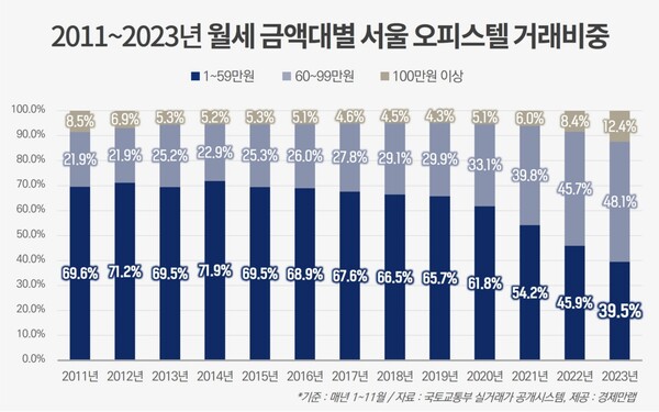 [SRT(에스알 타임스) 이정우 기자] 2023년 서울 오피스텔 계약에서 월세 60만원 미만 거래가 차지하는 비중이 역대 최저치로 나타났다. 전세사기 등의 여파로 전세 수요가 월세로 옮겨가면서 100만원 이상 고액 월세 계약이 늘어난 것이라는 분석이 나온다.