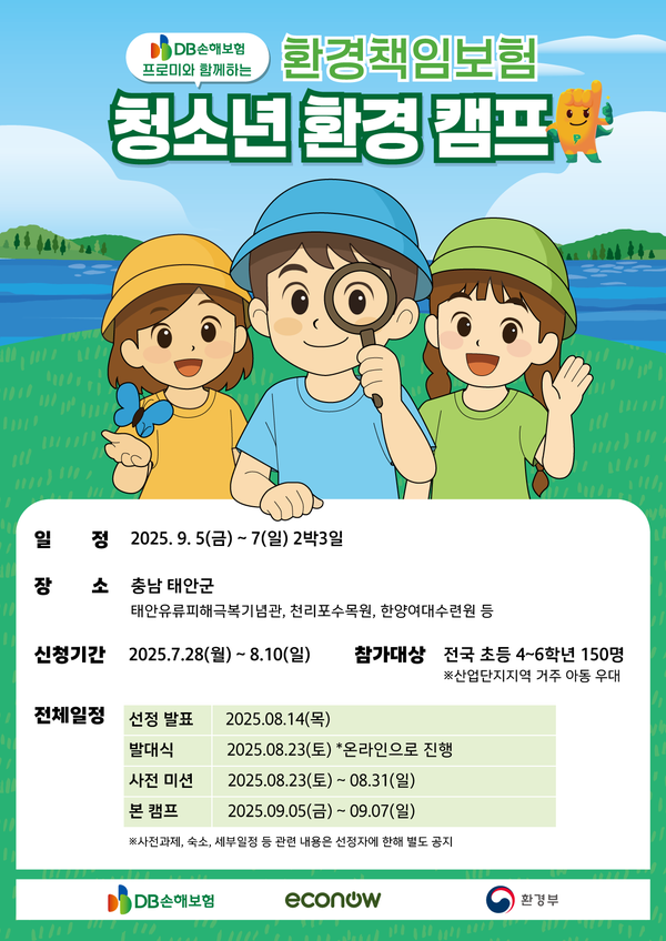 [SRT(에스알 타임스) 김남규 기자] DB손해보험은 환경단체 에코나우와 공동주최하는 ‘환경책임보험 청소년환경캠프‘ 참가자를 모집한다고 31일 밝혔다.