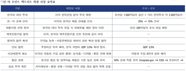 관세 조정도 관심을 모았다. 미국은 한국산 자동차·부품·목재제품 관세를 25%→15%로 인하하기로 했다. 자동차 업계 전체는 불확실성 해소에 긍정적 평가를 내놨지만, 관세 인하 시점이 명확히 명시되지 않은 점은 아쉬움으로 남았다.